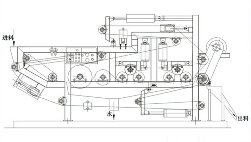 6、輥系排列科學有序,重力脫水、楔形脫水、壓榨脫水分別排出,互不干擾,壓榨脫水輥直徑比率大,脫